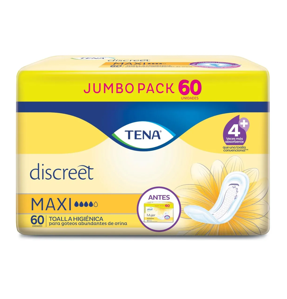 Tena Mujer Maxi de TENA ofrecen protección superior con máxima capacidad de absorción para flujo moderado a intenso. Diseño anatómico optimizado para máxima cobertura y seguridad. Disponible en presentaciones de 10, 30 y 60 unidades. Superficie suave garantiza comodidad prolongada durante todo el día. Compra tus toallas TENA en Pañalera Universal, con precios especiales y envío rápido a toda Colombia. Elige la presentación ideal y disfruta protección confiable con respaldo internacional de TENA.